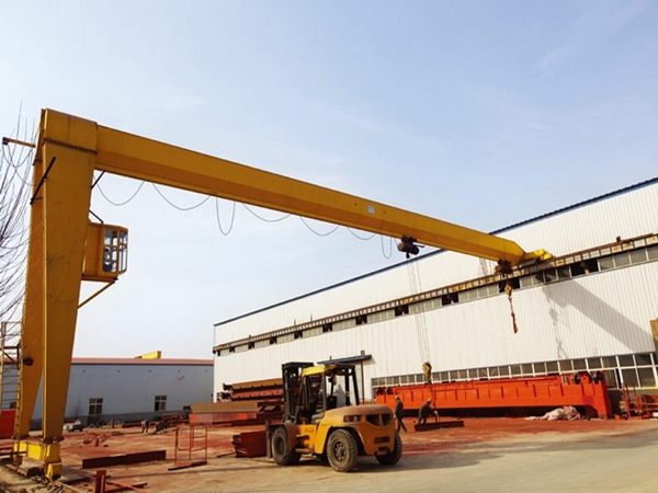 電動(dòng)葫蘆半門(mén)式起重機(jī)是有軌運(yùn)行的中小型起重設(shè)備,主要由門(mén)架(主梁、支腿、下橫梁等)、起升機(jī)構(gòu)、運(yùn)行機(jī)構(gòu)及電控部分組成,以電動(dòng)葫蘆作為起升機(jī)構(gòu),工作時(shí)沿主梁工字鋼下翼緣運(yùn)行。門(mén)架一側(cè)設(shè)有支腿,沿地面軌道上運(yùn)行,另一側(cè)無(wú)支腿,沿廠房上部軌道運(yùn)行,其余結(jié)構(gòu)和配置與MH型電動(dòng)葫蘆門(mén)式起重機(jī)一致。